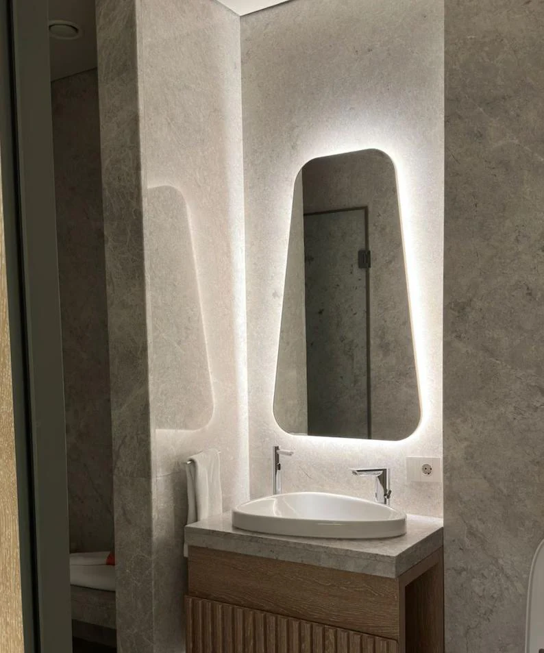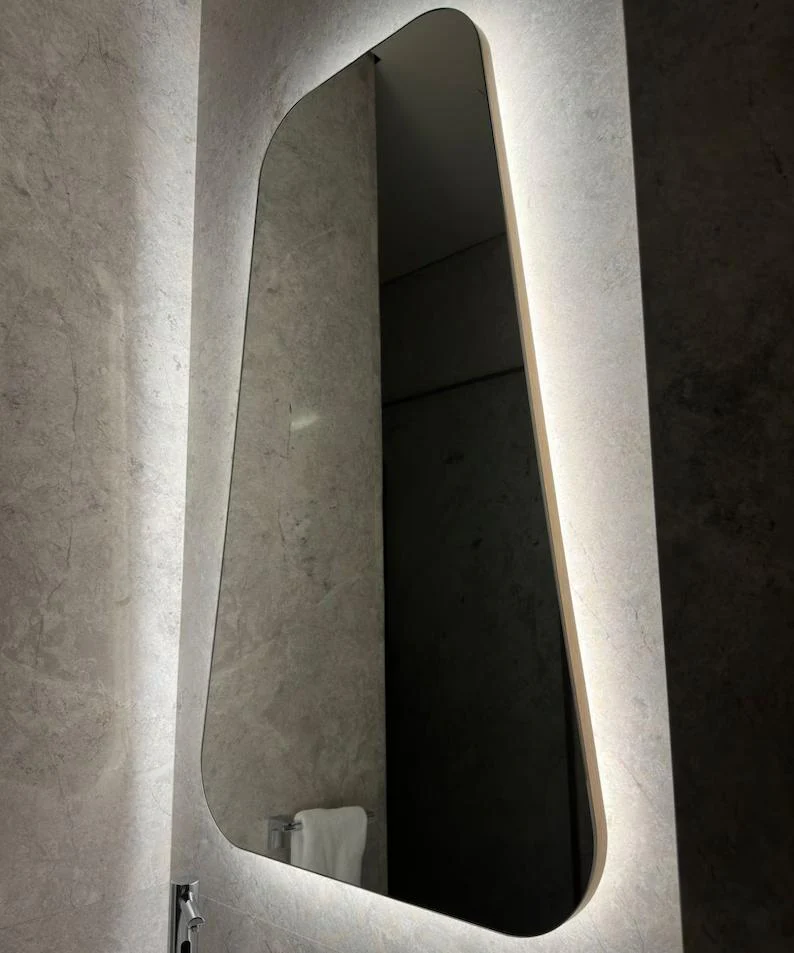 Asimetrik ve Benzersiz Tasarım: Bu ayna, hafif kavisli bir kenara sahip asimetrik bir tasarıma sahiptir, bu da ona modern ve şık bir görünüm kazandırır. Düzensiz şekil ve benzersiz dokular, herhangi bir odaya derinlik ve karakter katar.
